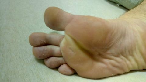 Dobrý den, pravděpodobně nepůjde o ekzém ani o plíseň, obojí je svědkové, takže byste si toho všiml dřív. Dle mého názoru jde o sloupnutou kůži, která byla delší dobu rozmočená, nebo zpocená.